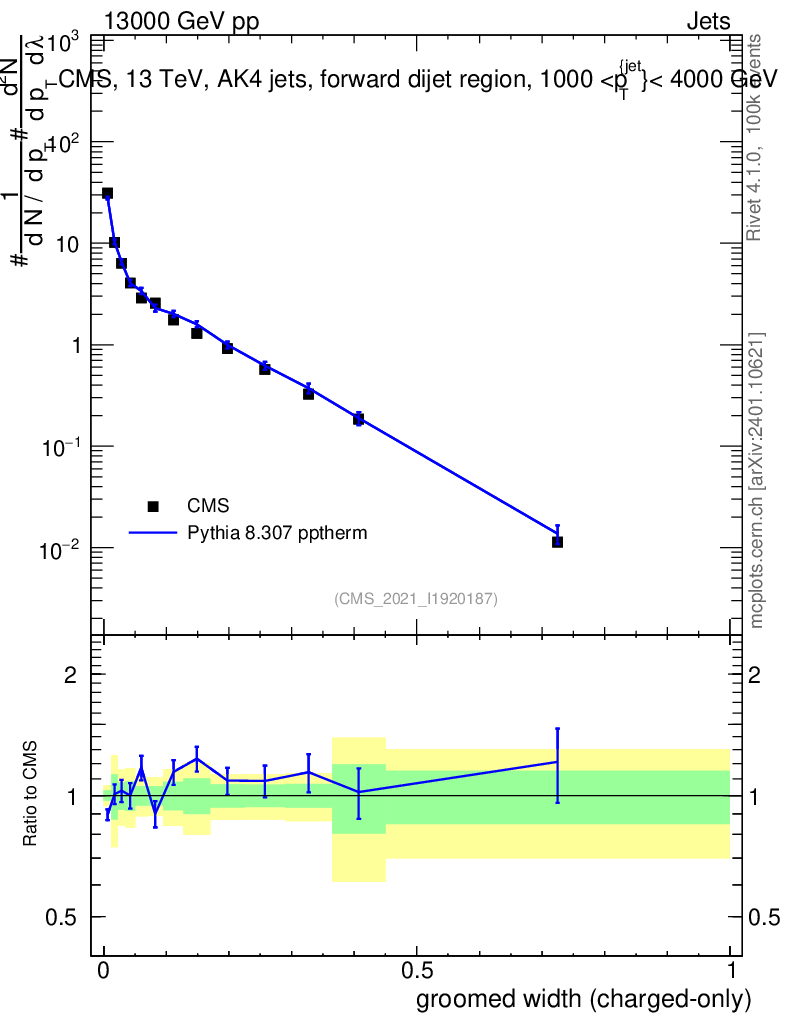 Lines: data, pythia8 8.307 pptherm |