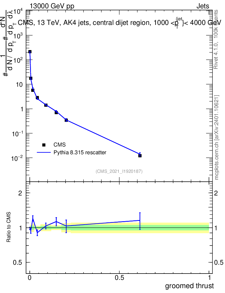 Lines: data, pythia8 8.315 rescatter |