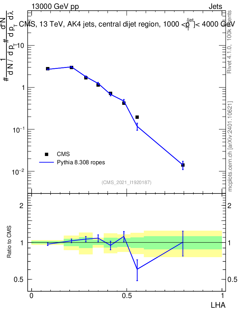 Lines: data, pythia8 8.308 ropes |