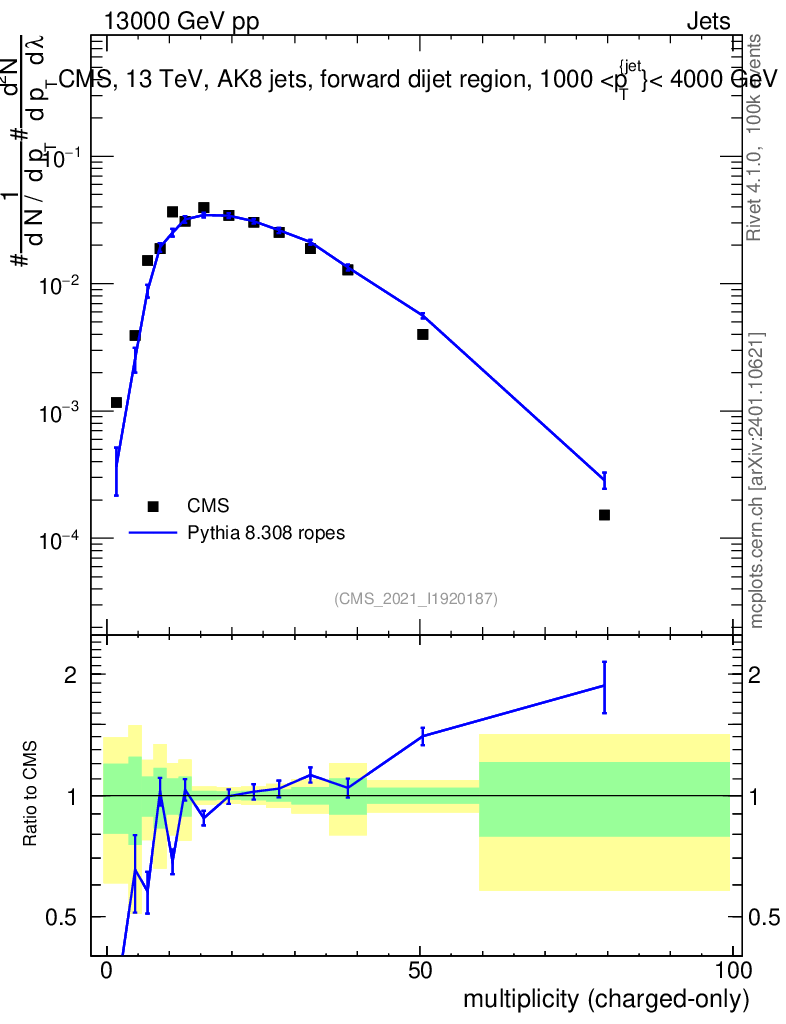 Lines: data, pythia8 8.308 ropes |