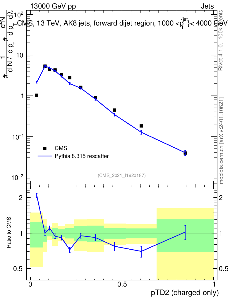 Lines: data, pythia8 8.315 rescatter |