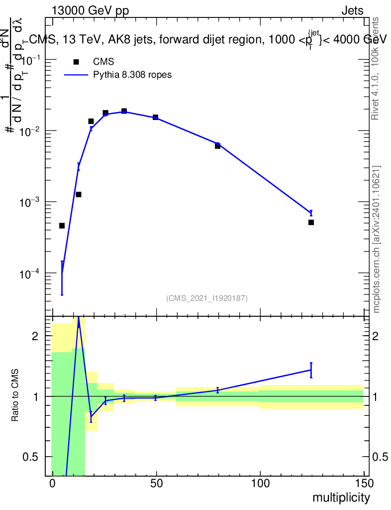 Lines: data, pythia8 8.308 ropes |