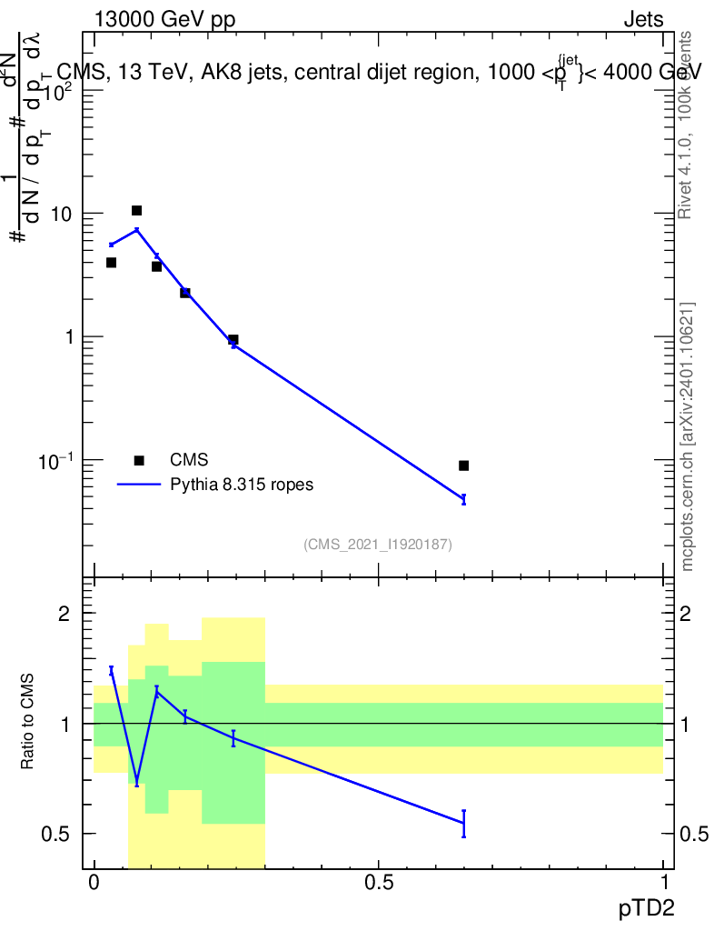 Lines: data, pythia8 8.315 ropes |