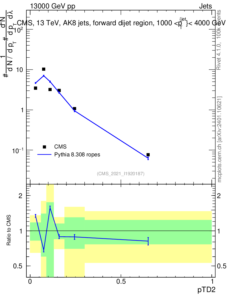 Lines: data, pythia8 8.308 ropes |