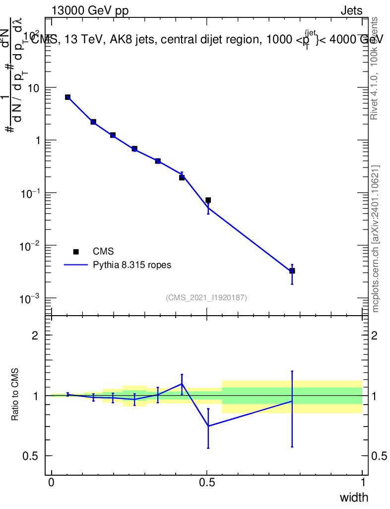 Lines: data, pythia8 8.315 ropes |