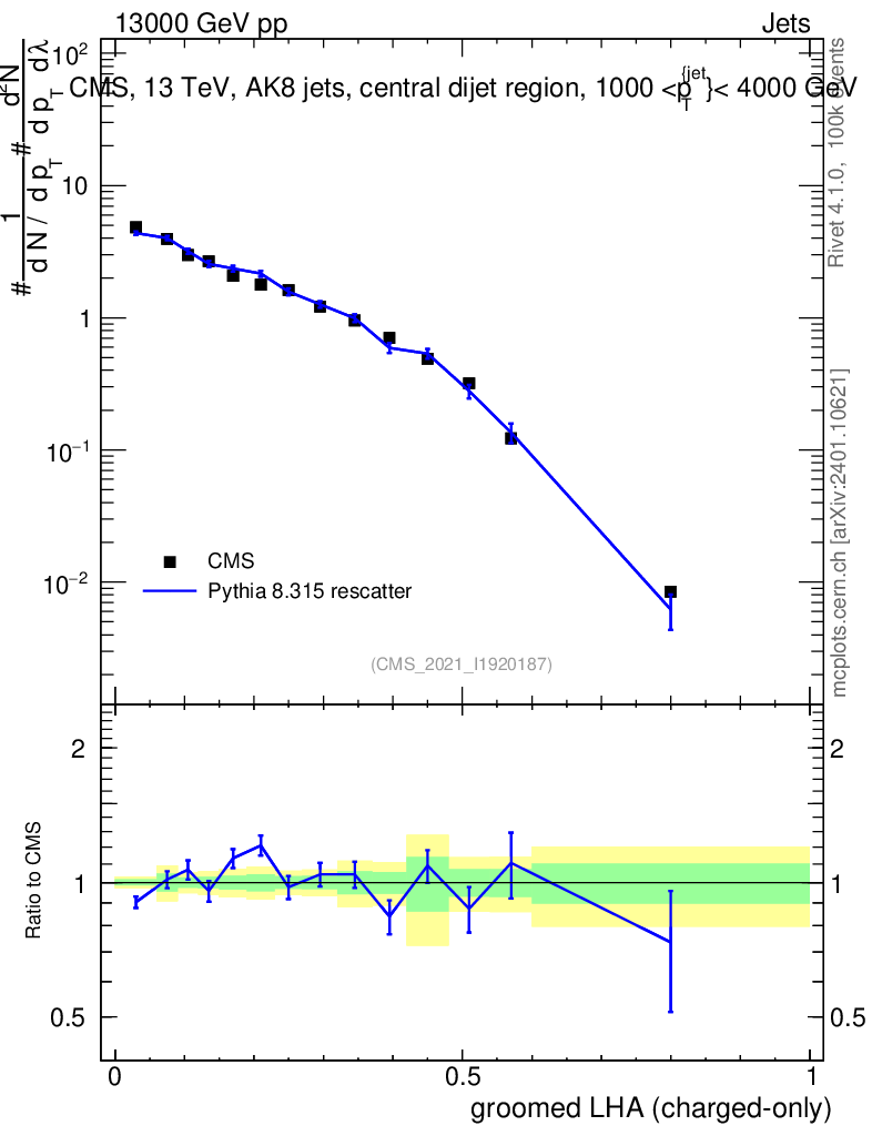 Lines: data, pythia8 8.315 rescatter |