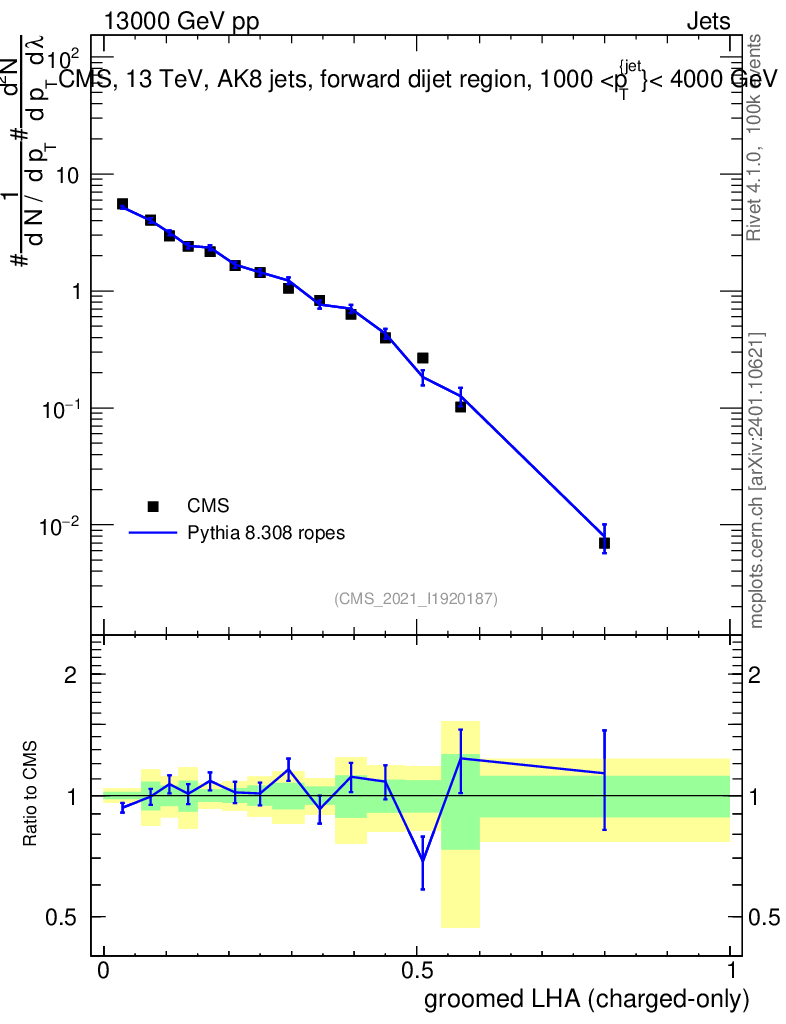 Lines: data, pythia8 8.308 ropes |