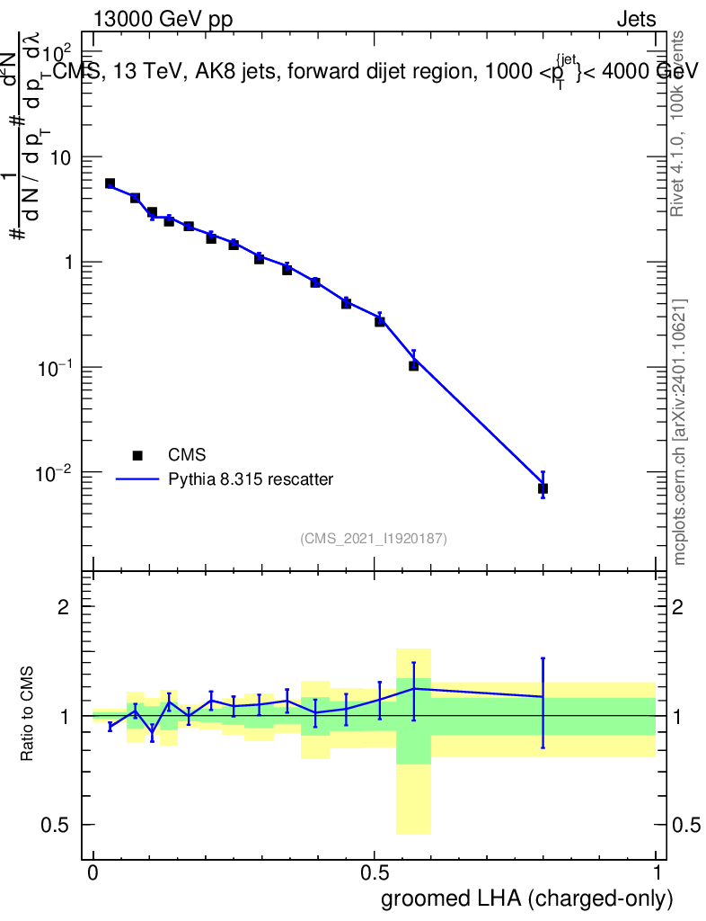 Lines: data, pythia8 8.315 rescatter |