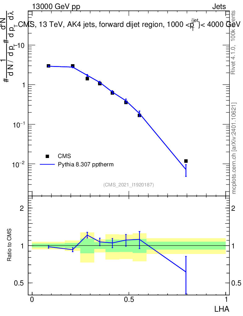 Lines: data, pythia8 8.307 pptherm |