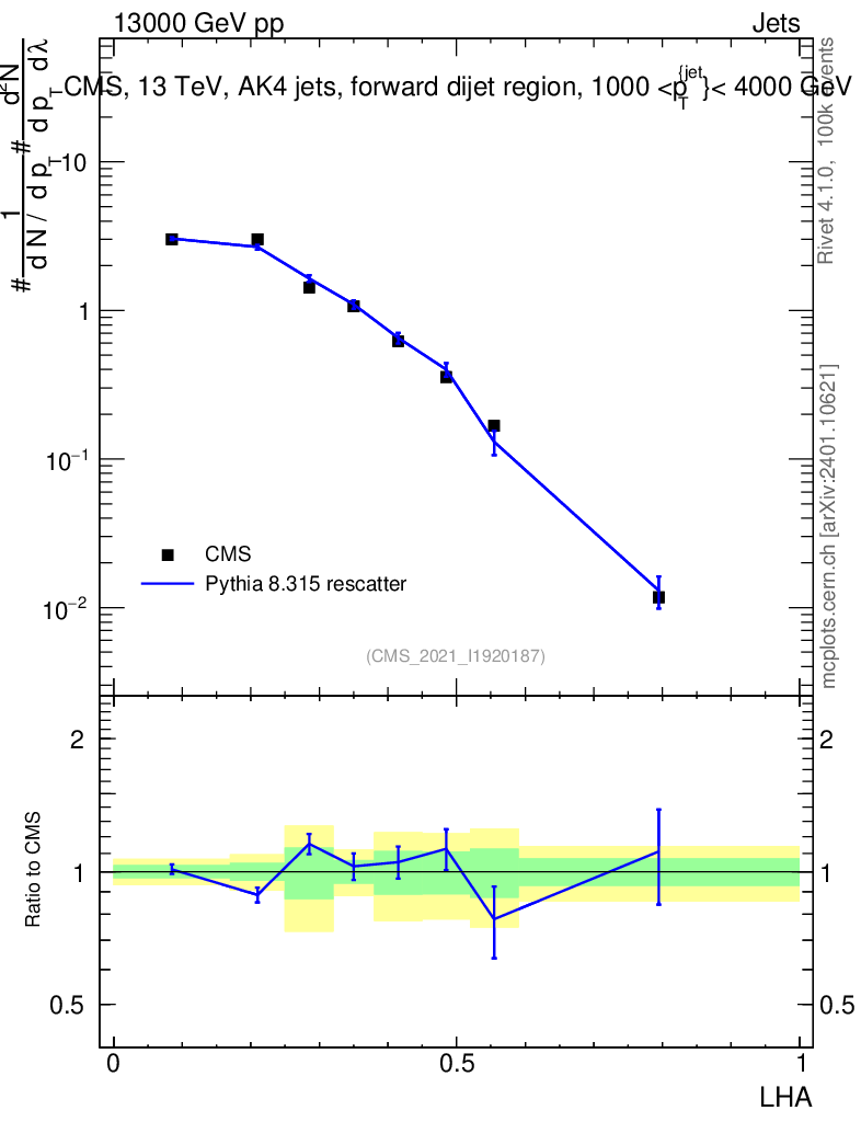 Lines: data, pythia8 8.315 rescatter |