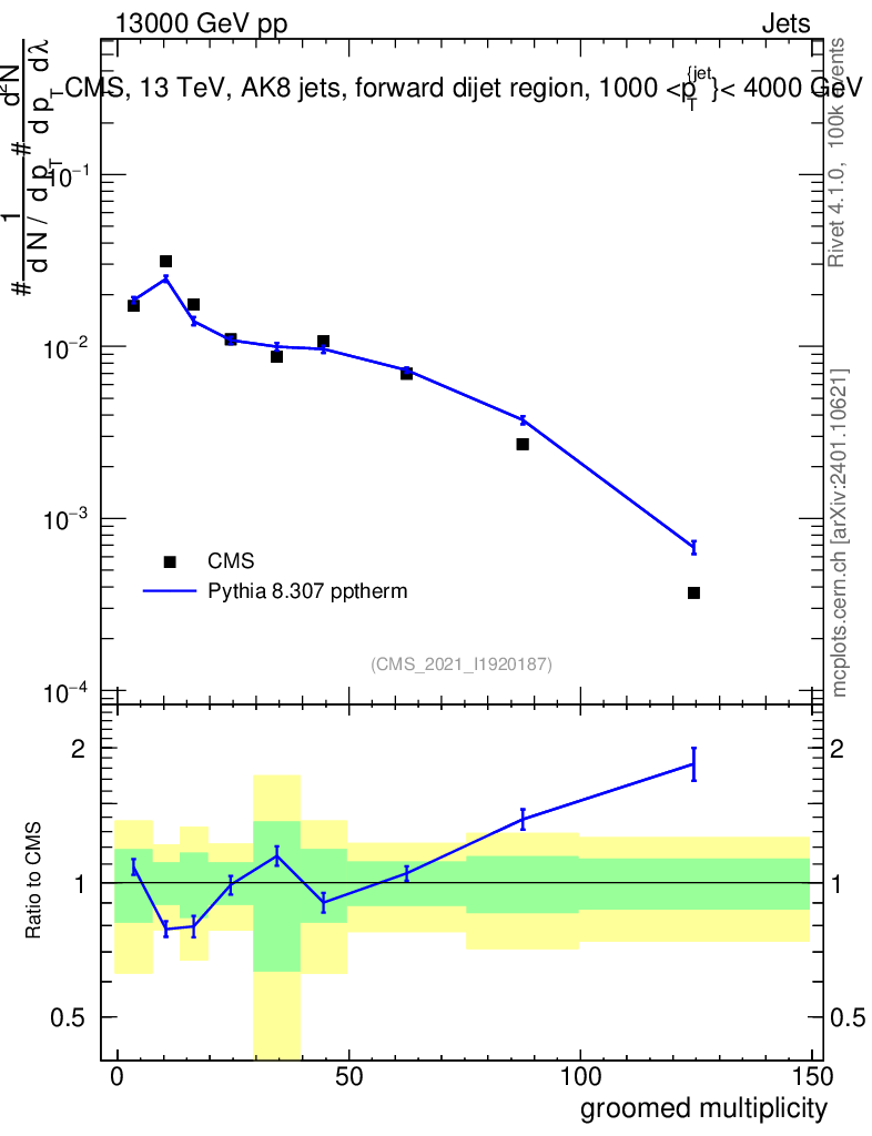Lines: data, pythia8 8.307 pptherm |