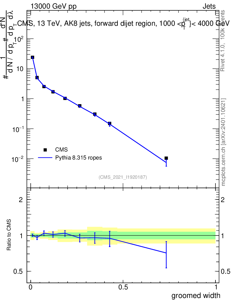 Lines: data, pythia8 8.315 ropes |