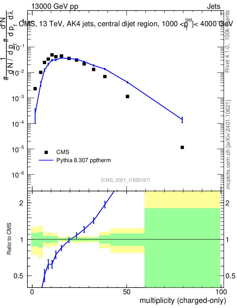 Lines: data, pythia8 8.307 pptherm |
