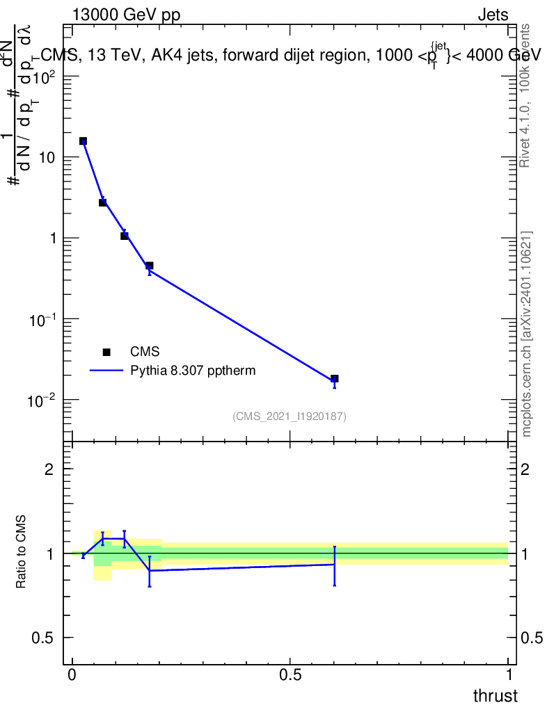 Lines: data, pythia8 8.307 pptherm |