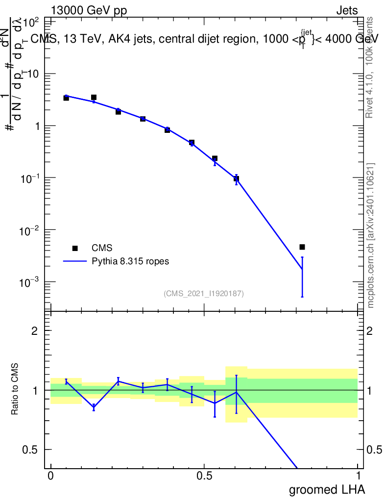 Lines: data, pythia8 8.315 ropes |
