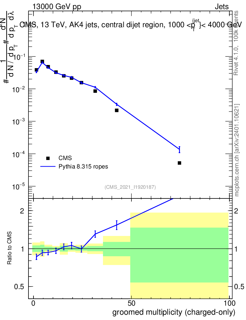 Lines: data, pythia8 8.315 ropes |