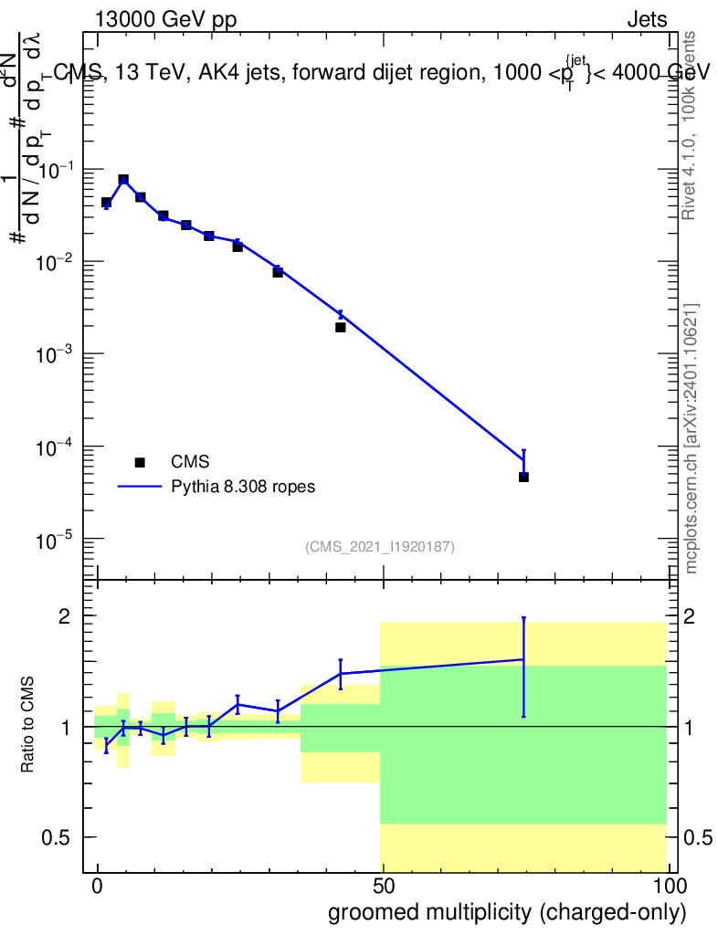 Lines: data, pythia8 8.308 ropes |