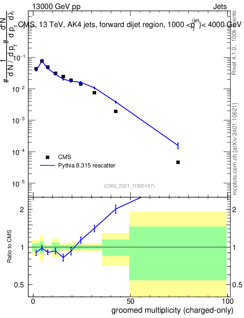 Lines: data, pythia8 8.315 rescatter |