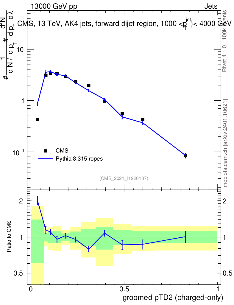 Lines: data, pythia8 8.315 ropes |