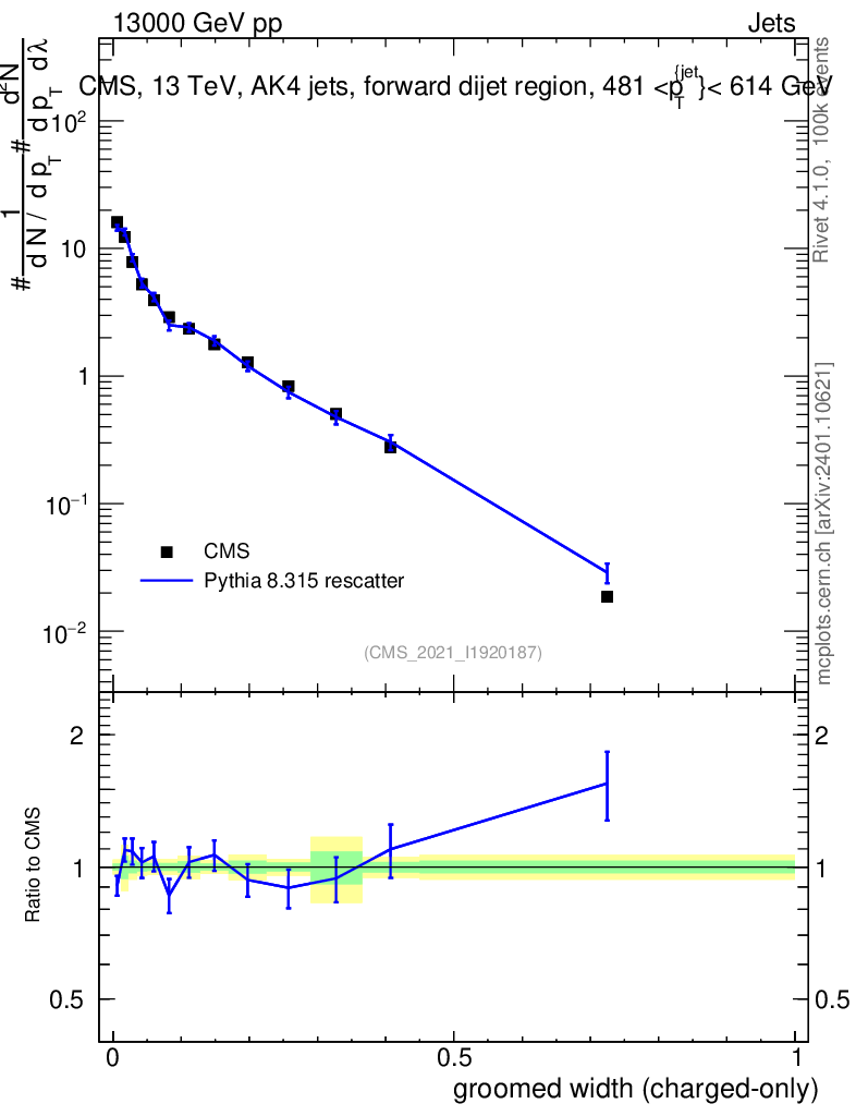 Lines: data, pythia8 8.315 rescatter |