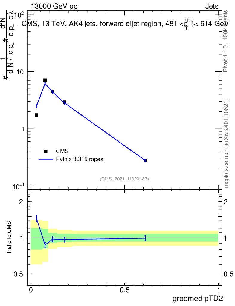 Lines: data, pythia8 8.315 ropes |