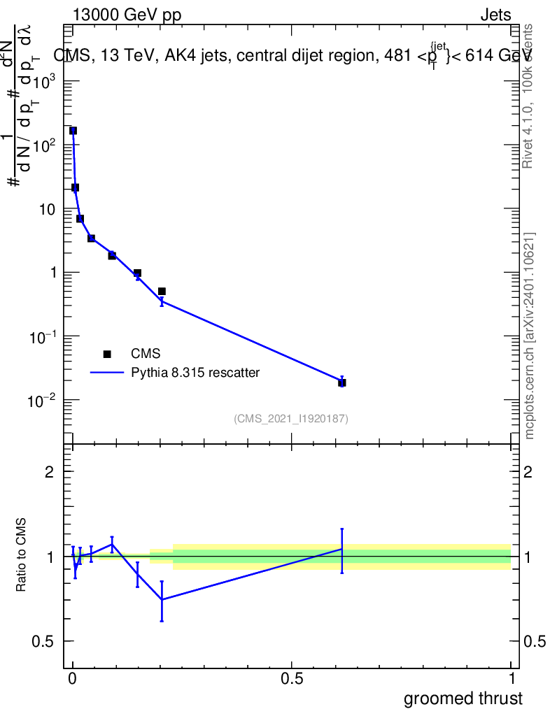 Lines: data, pythia8 8.315 rescatter |