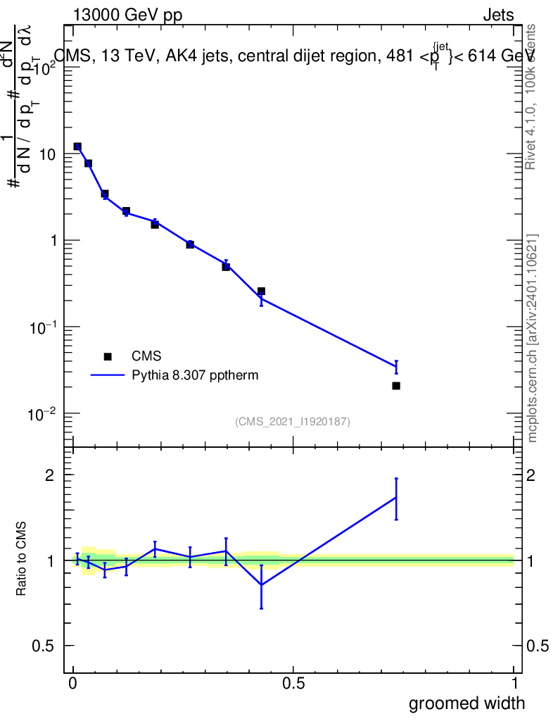 Lines: data, pythia8 8.307 pptherm |