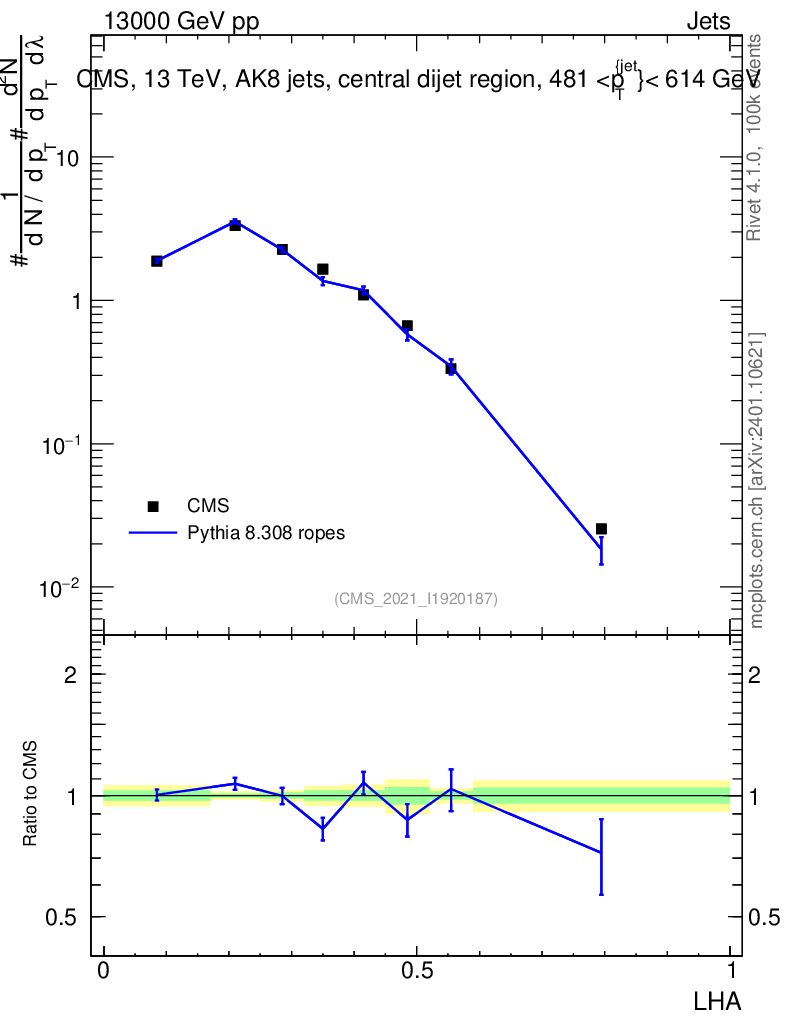 Lines: data, pythia8 8.308 ropes |