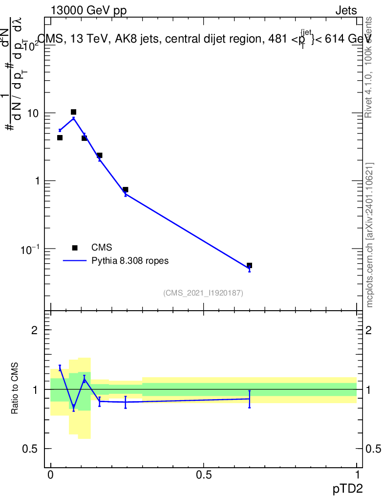 Lines: data, pythia8 8.308 ropes |
