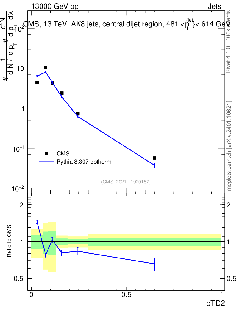 Lines: data, pythia8 8.307 pptherm |