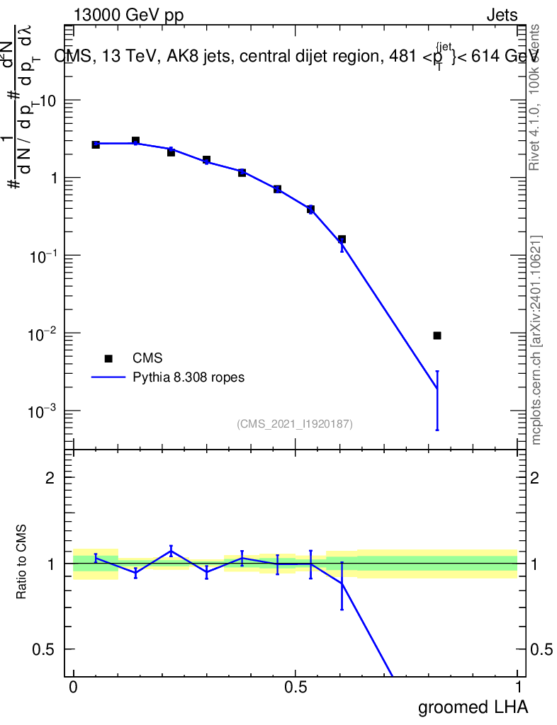 Lines: data, pythia8 8.308 ropes |