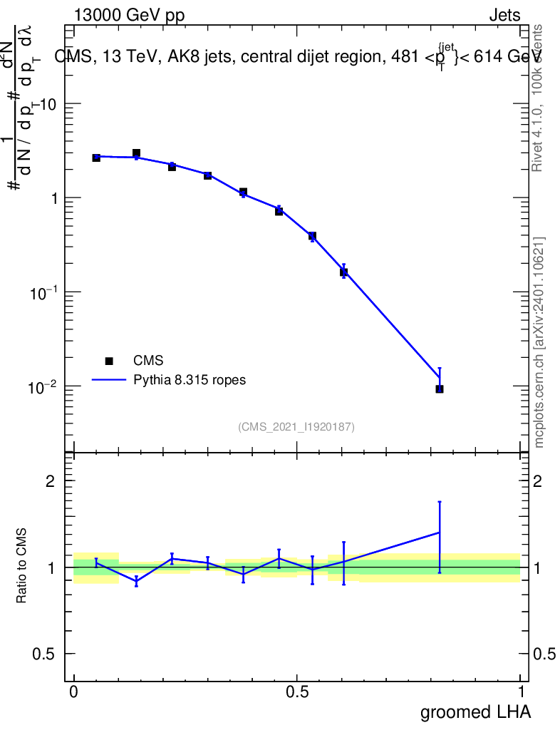 Lines: data, pythia8 8.315 ropes |