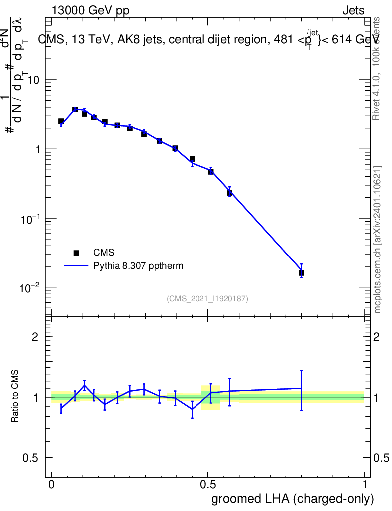 Lines: data, pythia8 8.307 pptherm |