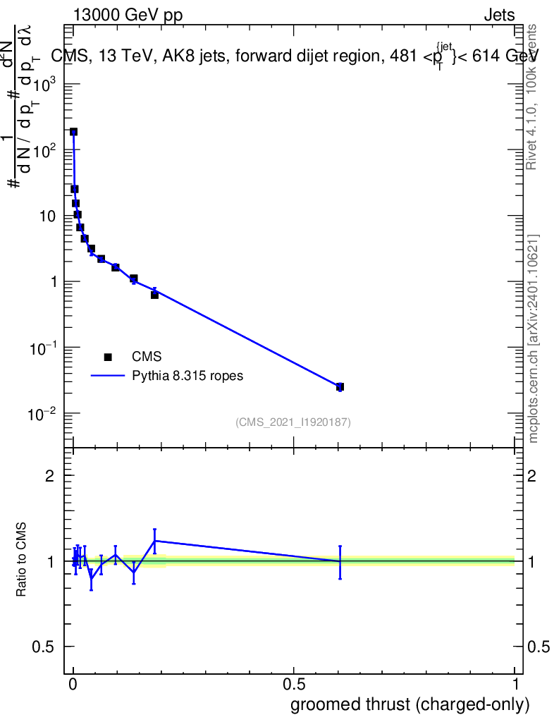 Lines: data, pythia8 8.315 ropes |