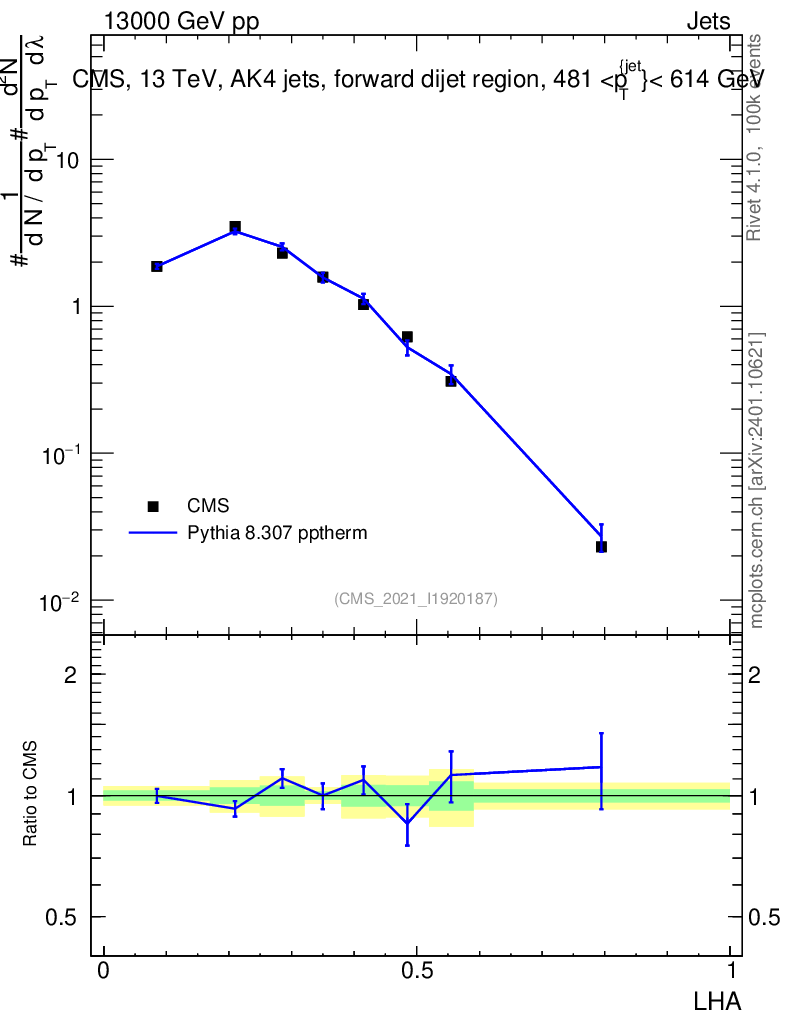 Lines: data, pythia8 8.307 pptherm |
