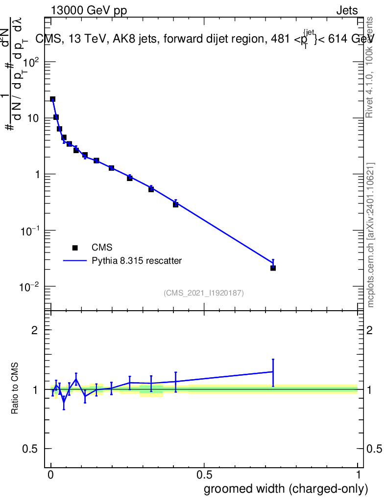 Lines: data, pythia8 8.315 rescatter |