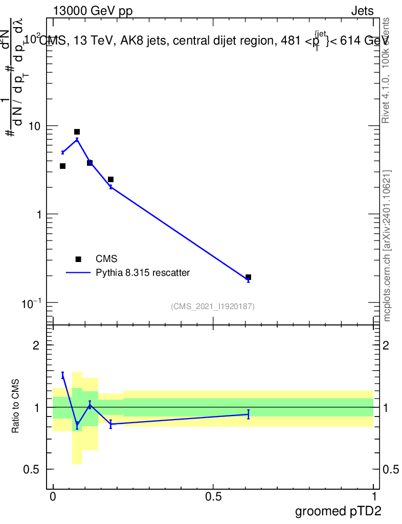 Lines: data, pythia8 8.315 rescatter |