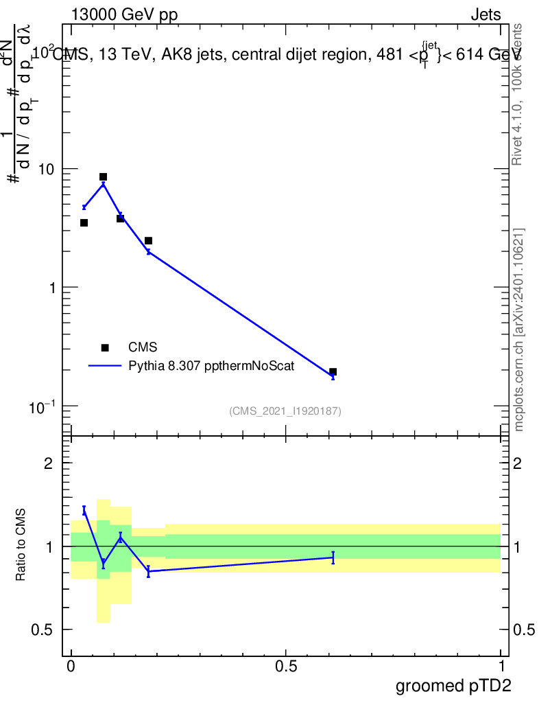 Lines: data, pythia8 8.307 ppthermNoScat |