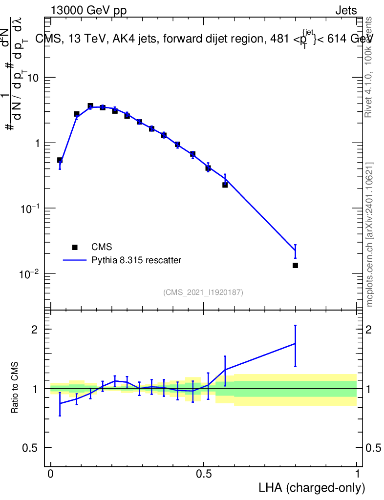 Lines: data, pythia8 8.315 rescatter |