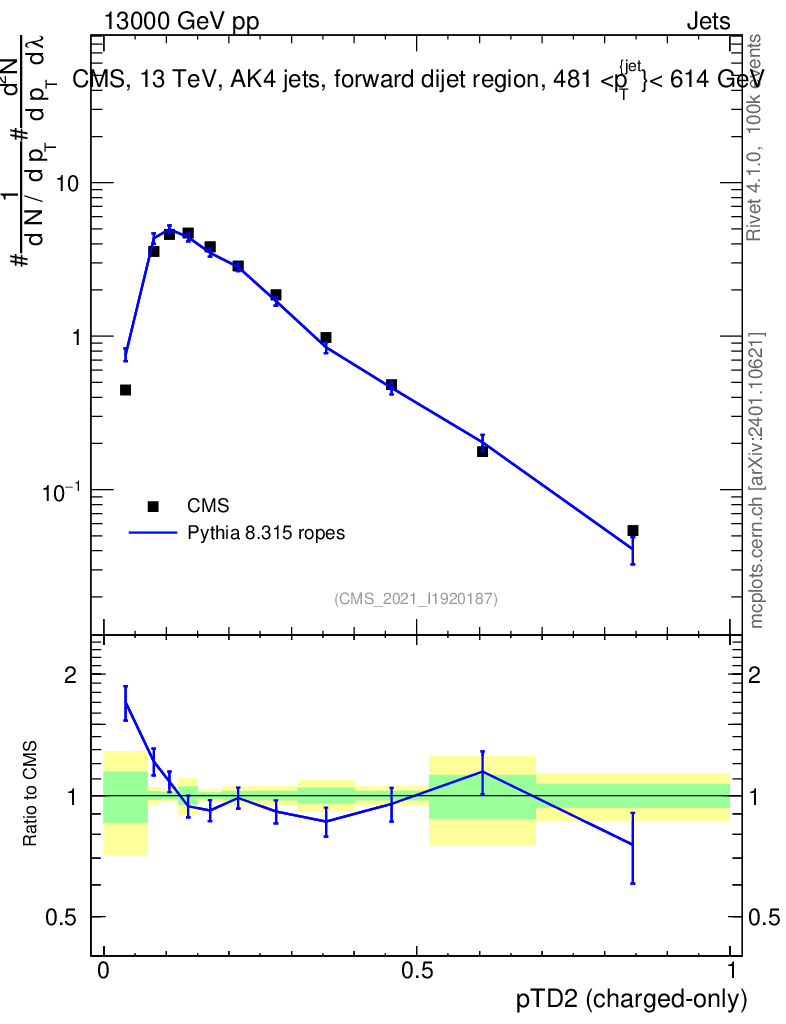Lines: data, pythia8 8.315 ropes |