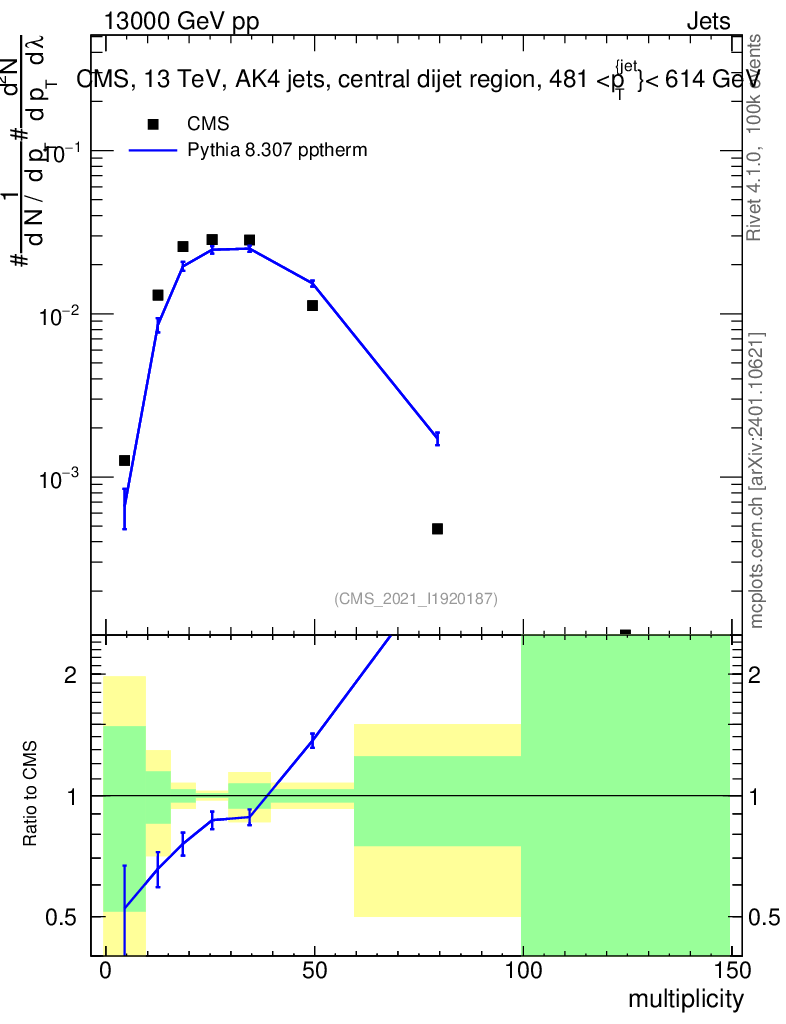 Lines: data, pythia8 8.307 pptherm |