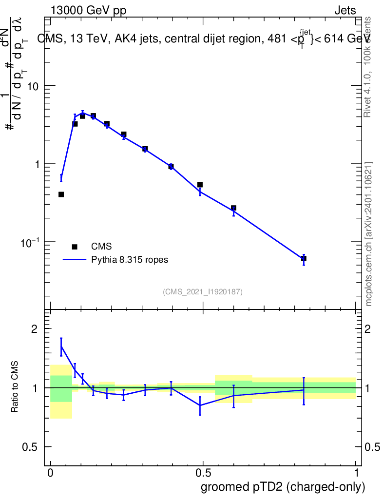 Lines: data, pythia8 8.315 ropes |