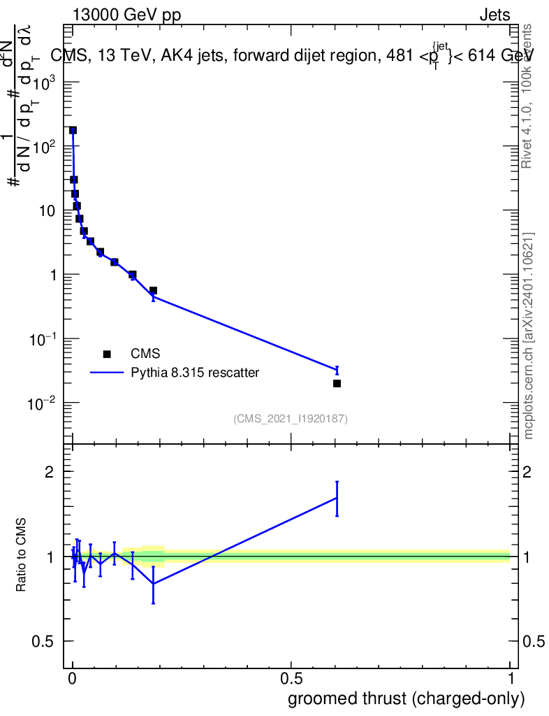Lines: data, pythia8 8.315 rescatter |