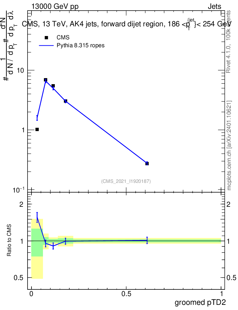 Lines: data, pythia8 8.315 ropes |