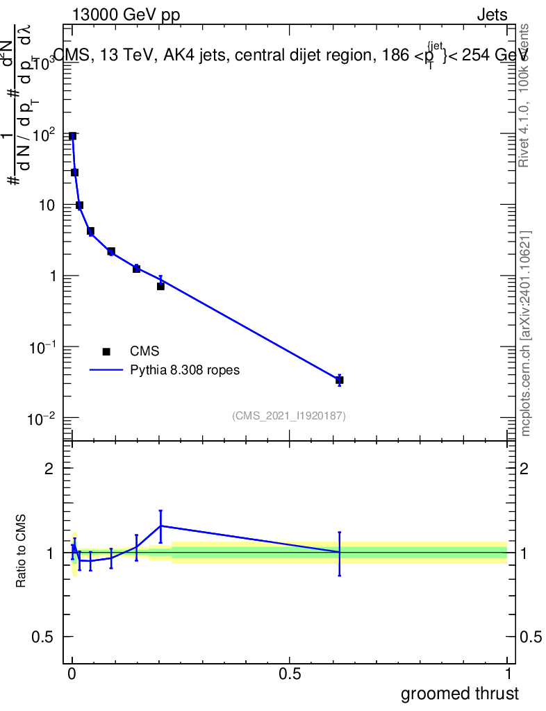 Lines: data, pythia8 8.308 ropes |
