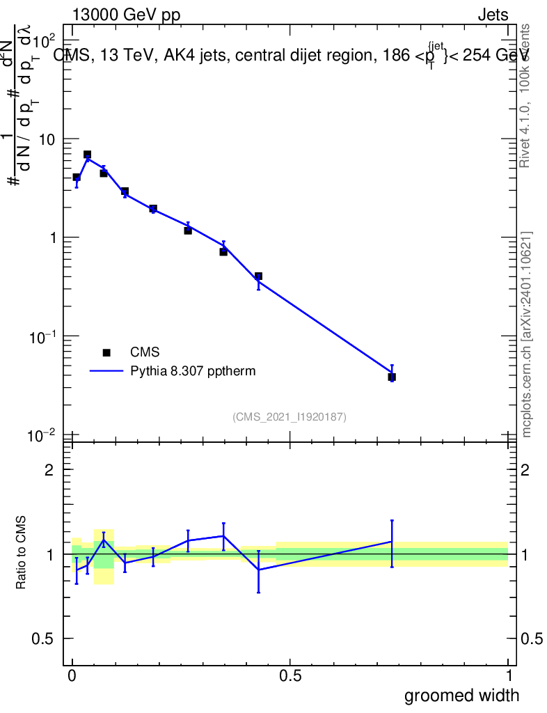 Lines: data, pythia8 8.307 pptherm |