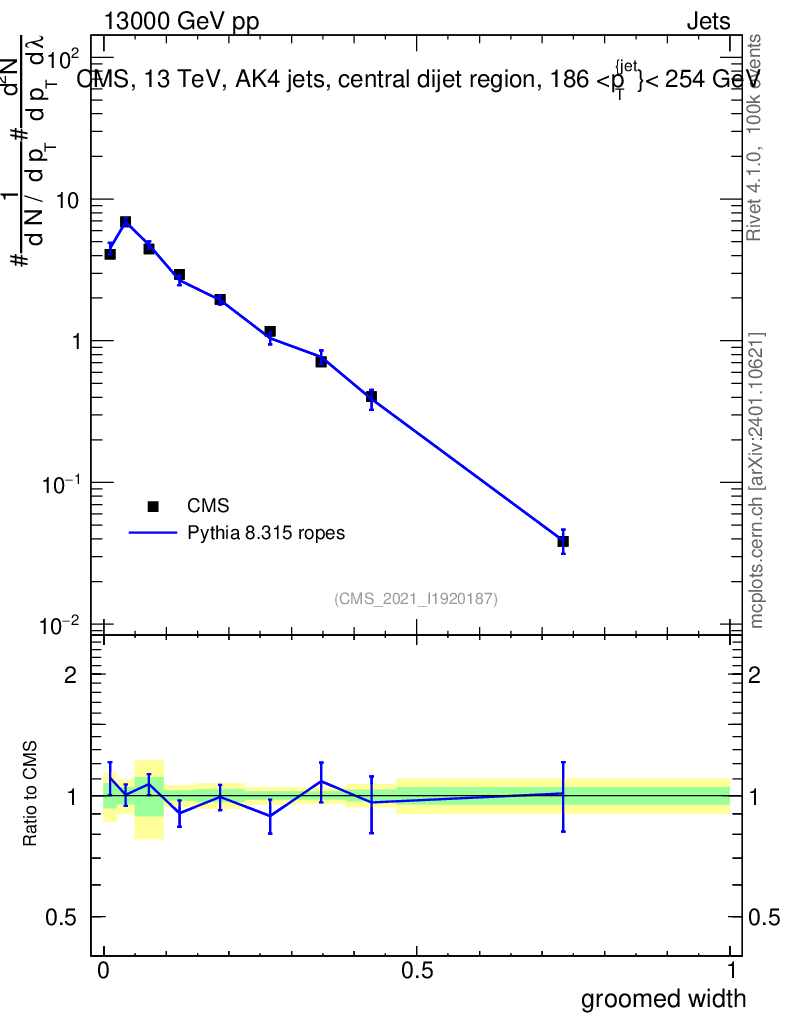 Lines: data, pythia8 8.315 ropes |