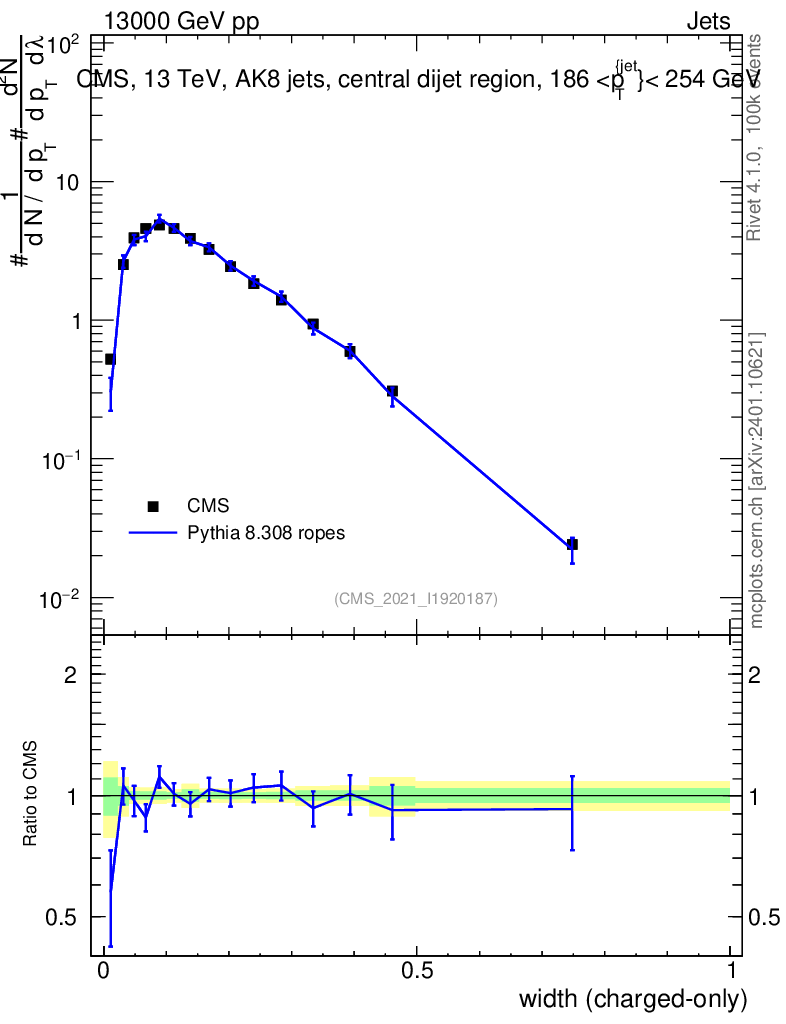 Lines: data, pythia8 8.308 ropes |