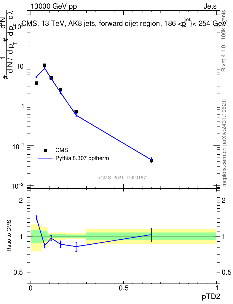 Lines: data, pythia8 8.307 pptherm |
