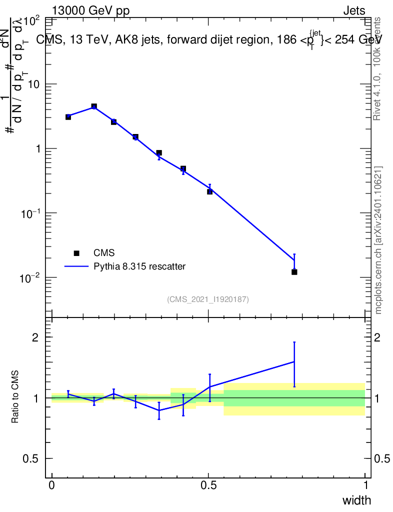 Lines: data, pythia8 8.315 rescatter |